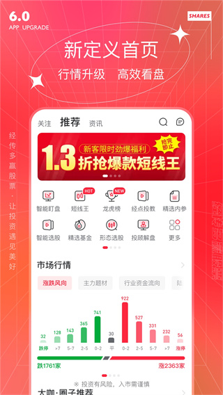 8、大盘分析全新的大盘分析功能,全面监控行情动态,规避风险、把握上涨行情。