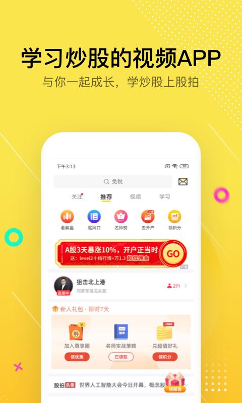 快下载股拍APP,开启股票学习之旅。尊享个性化资讯、短视频、在线教学服务,迅速股票入门,成为炒股高手。