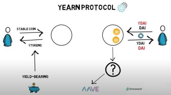 用户将稳定币(USDT、USDC、DAI 等等)存入协议中,获得像是yUSDT、yUSDC、yTUSD、yDAI 等代币,统称为yToken