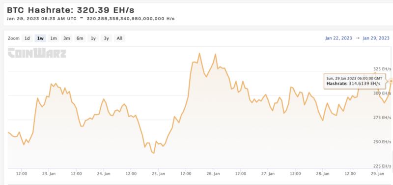 而算力部分,根据CoinWarz数据显示,当下BTC全网算力(hashrate)为320.39EH/s,在过去一个礼拜内全网算力保持在275EH/s水准以上,象征矿工回巢开机比例增高,趁价追击挖矿出售