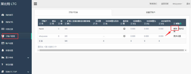 3、在子账号列表里找到需要删除的账号,点击解除,并确认